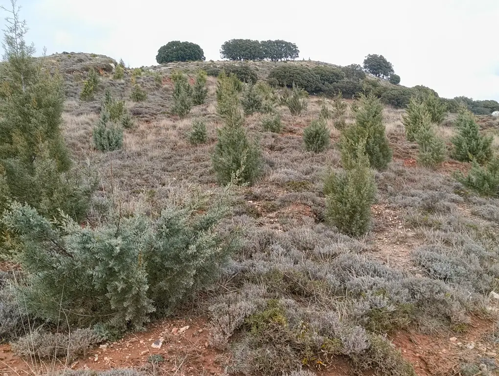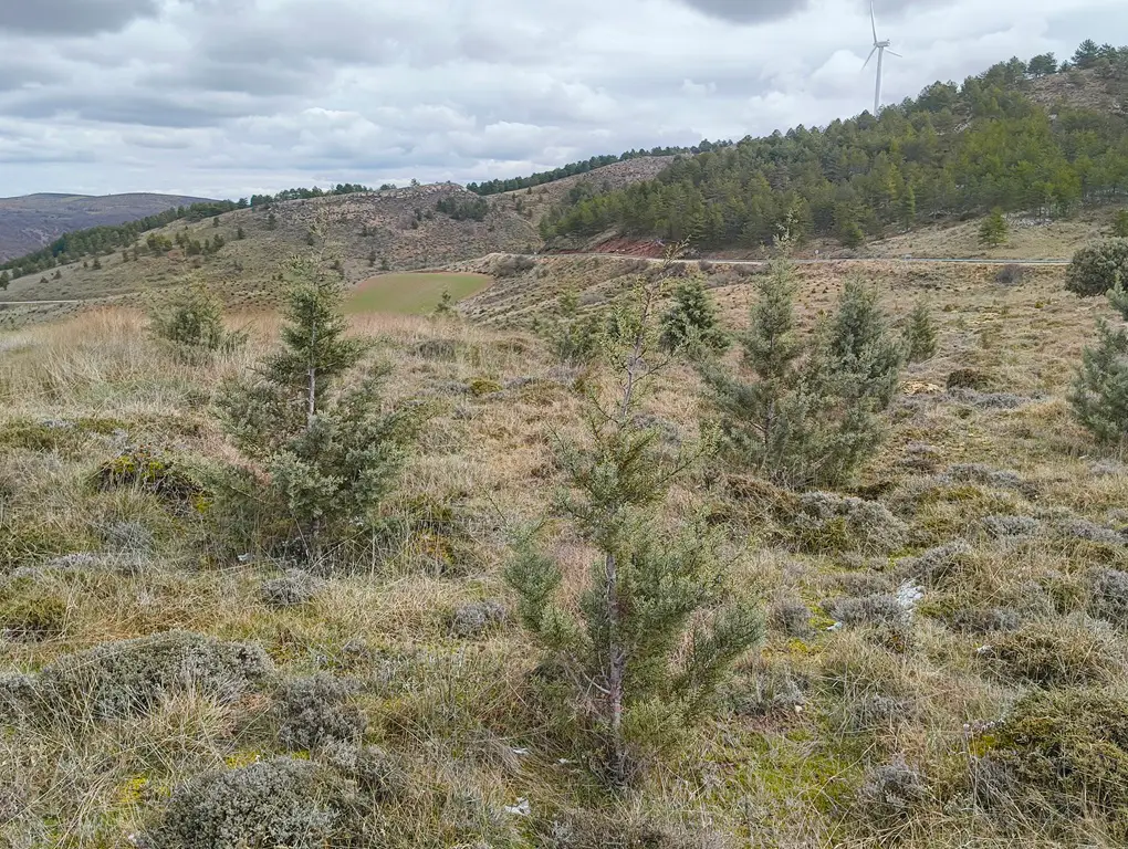 Forestación pluriespecífica en terrenos baldíos con especies autóctonas muy apreciadas en la comarca, sabinas, enebros, etc …, aumentando la biodiversidad del término, así como futuro de refugio de fauna en un territorio tan agreste.